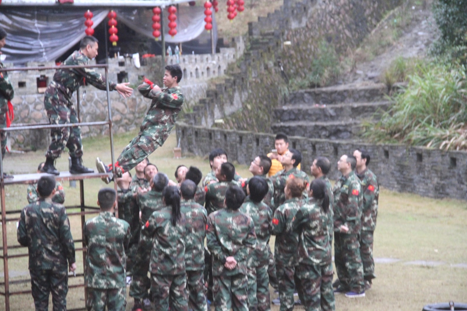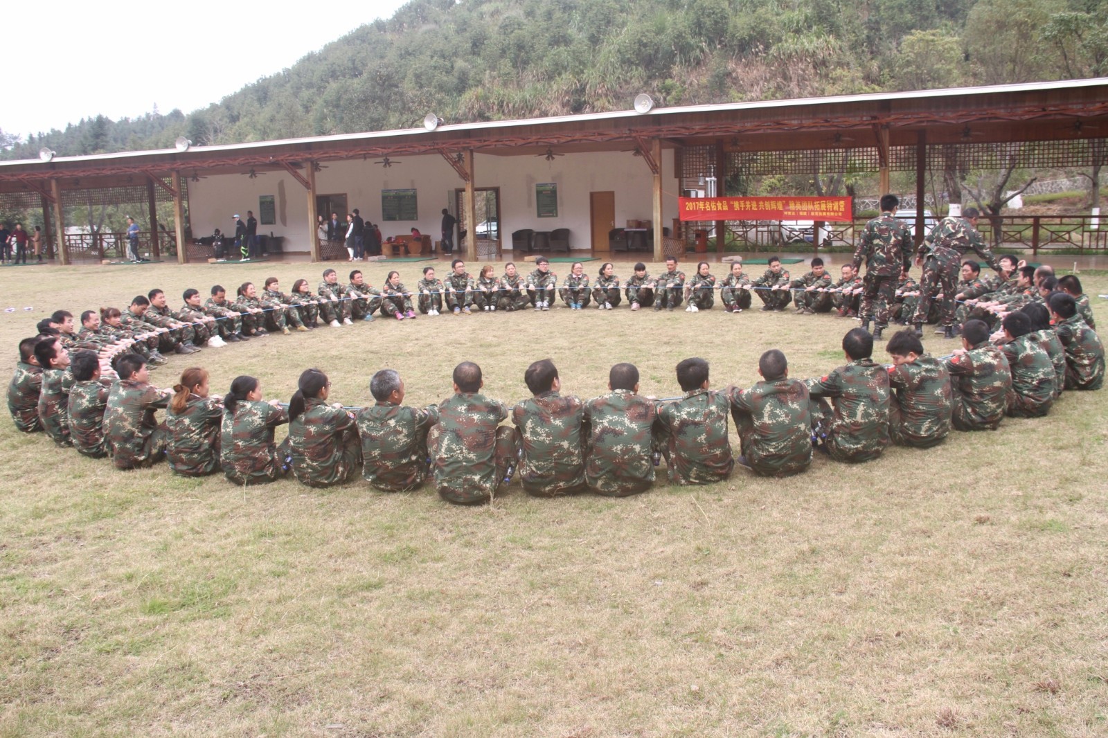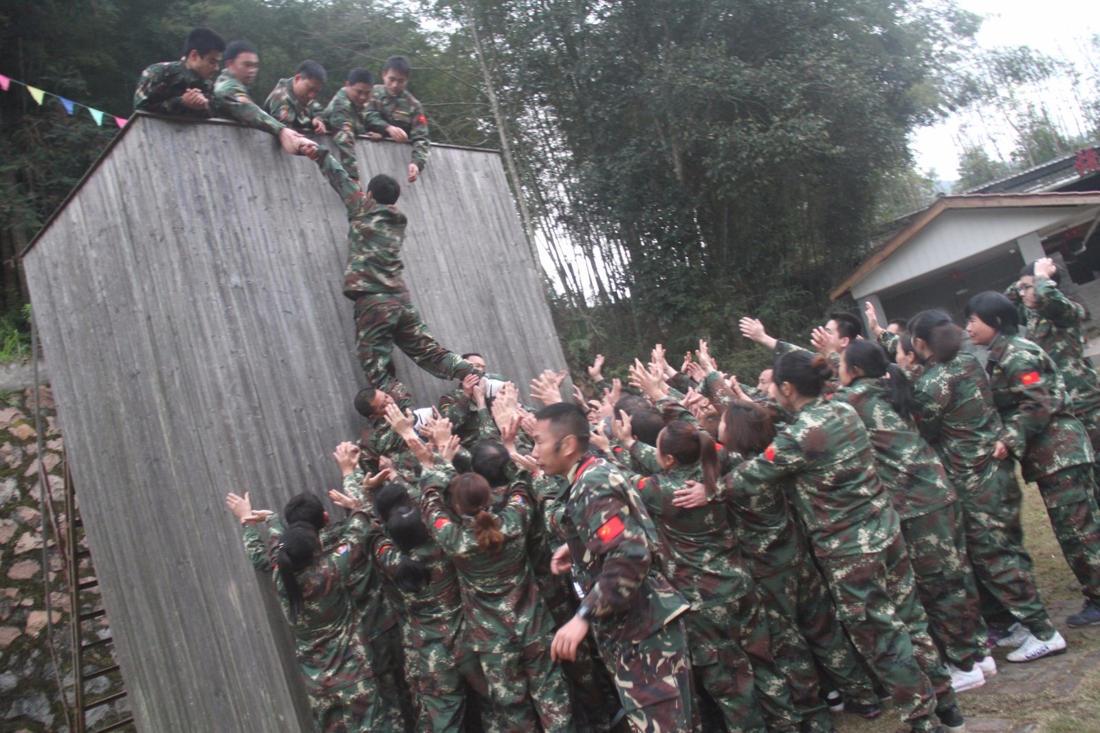 第一天團隊統(tǒng)一著裝迷彩服,進行團隊組建并建立統(tǒng)一的團隊目標(biāo)。參加心情撲克牌、高空抓桿、盜夢空間、七巧板等項目。