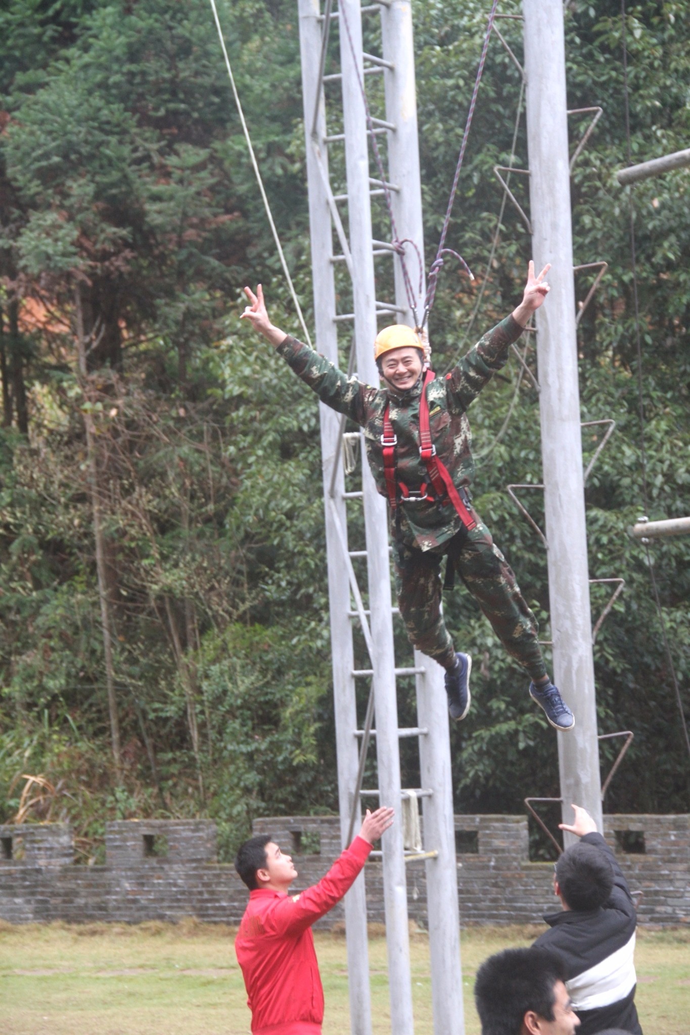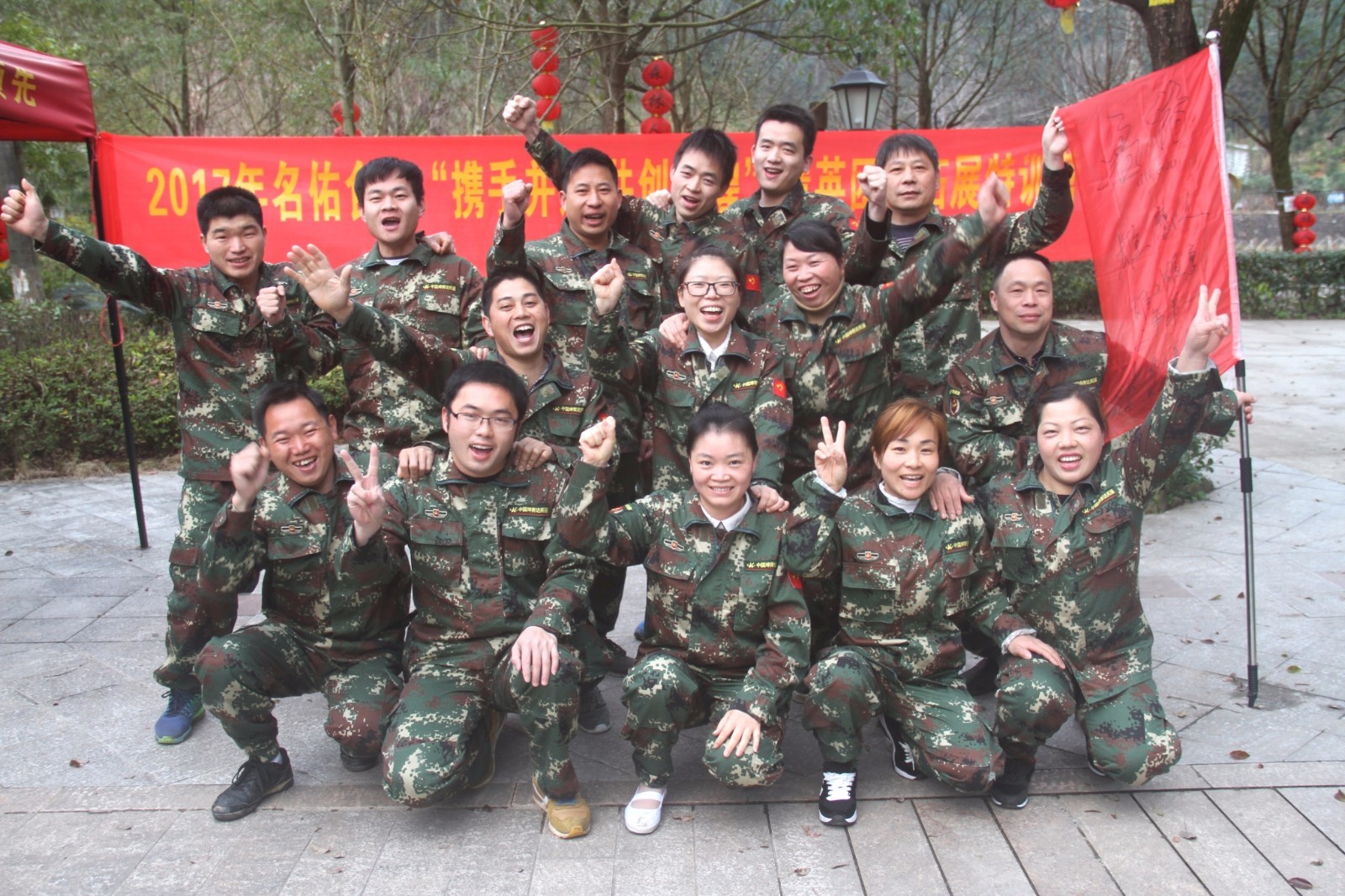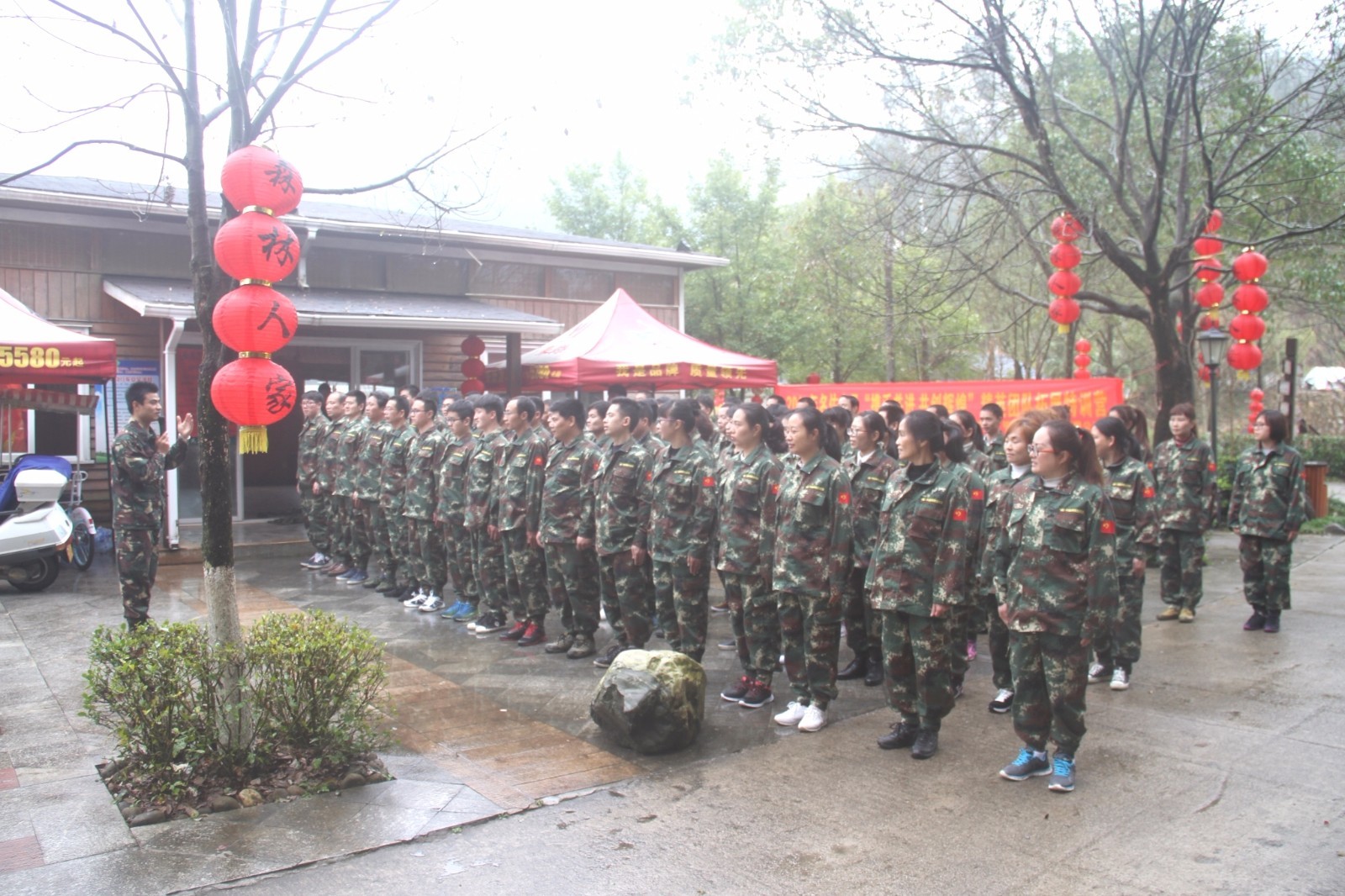 第一天團隊統(tǒng)一著裝迷彩服,進行團隊組建并建立統(tǒng)一的團隊目標(biāo)。參加心情撲克牌、高空抓桿、盜夢空間、七巧板等項目。